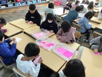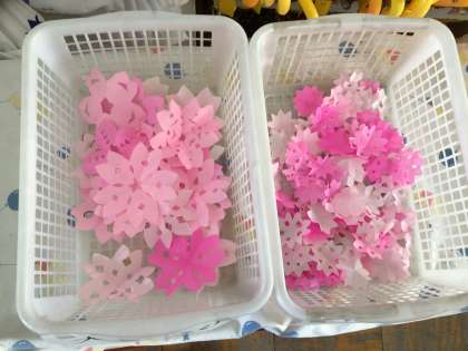 2年生も、昇降口の掲示板を飾りつけるための桜の切り紙をたくさん作りました。