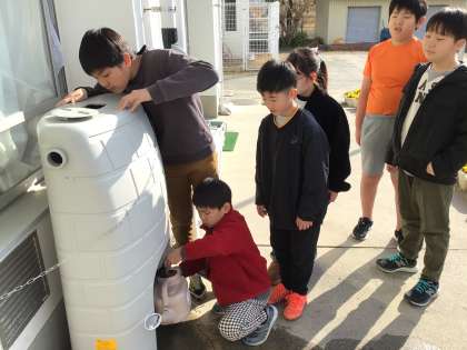 雨水タンクが設置されました。自然の良さを生かす良さをみんなが感じてくれたらうれしいです。