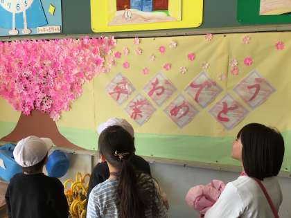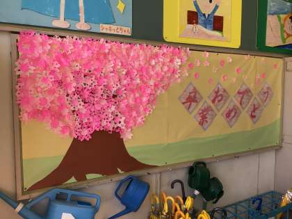 2年生の子どもたちが作成した、桜の切り紙をたくさん使って、昇降口に桜の掲示を作りました。