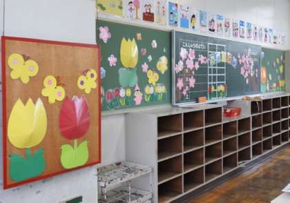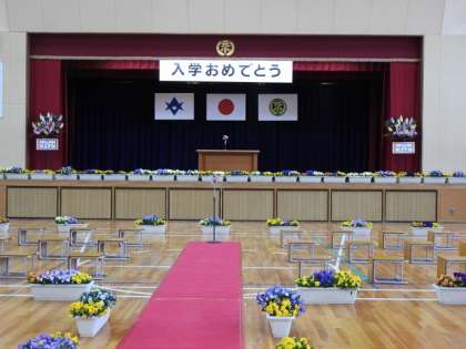 4月4日 昨日までの雨もあがり、正門近くの通りにある桜の木には、たくさんの花が咲いていました。今日は、入学式・始業式の日。前日から新6年生が登校して、体育館や教室の準備をしました。