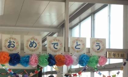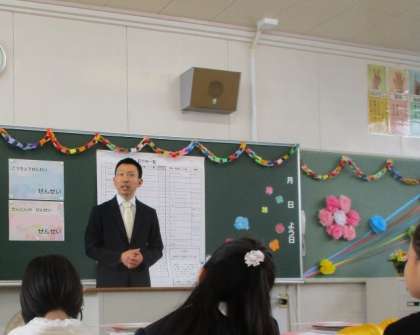 1年生の教室は、校舎の2階にあります。入り口には、おめでとうの文字が。入学式のあとの学級活動では、担任の先生からお話がありました。今日から始まる元城小学校での生活についてお話がありました。担任の先生も、1年生の皆さんも、ちょっぴり緊張してます。