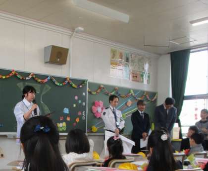 先生のお話のあとで、豊田警察署の方、地域の企業の方、交通安全協会の方、ダンプカー協会の方から、交通安全についてのお話をいただきました。1年生のみなさんが、交通安全に気を付けて、安全に楽しく学校へ通学できるよう、プレゼントもいただきました。