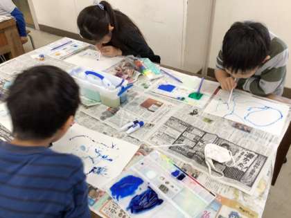 絵の具を使って、ストローで吹いたり、水をたくさん使ってぼかしたり、歯ブラシで弾いたりして描くなど、さまざまな技法に挑戦しました。いつもとは一味違う絵を1人でたくさん作ることができました。