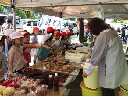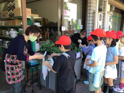 2年生は町探検に出かけました。まず、桜町商店街の理事長さんのお話を聞いた後、商店街で、一人一人が育てたい野菜の苗を買いました。その後、挙母神社で毎月八日に開催される「八日市亅を見学しました。漬物や乾物、履き物や洋服、鮎の塩焼きやお団子などいろいろなお店が出店しており、どの子も興味津々でした。お店の方が子どもたちと気さくに話してくださり、どの子も楽しく学ぶことができ八日市が大好きになりました。