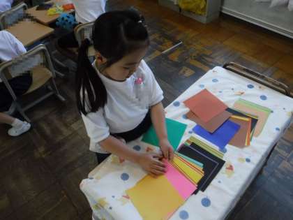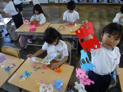 折り紙を2〜3回折って、紙の一部をはさみで切り取って開くと、いろんな模様、形が表れます。その様子を楽しみながら、いろいろな形の出し方を試しました。