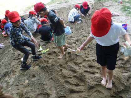 砂に手や足を入れた子どもたちは、「気持ちいい〜!」と歓声をあげ、「さらさら」「ふわふわ」した感触を味わいました。