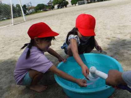 水を汲んできて、砂場に川や水たまりを作ったり、砂を積んでお城や食べ物を作ったりと、たっぷりと砂で楽しむことができました。