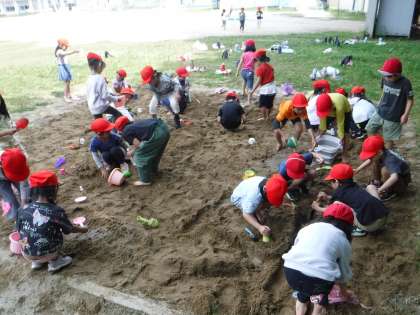 今日は砂場で、砂の感触を味わったり、砂でできるものを作ったりする学習を行いました。