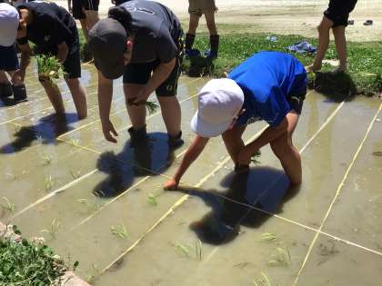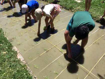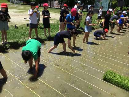 縦と横にロープを張り、間隔に気をつけながら丁寧に植えました。