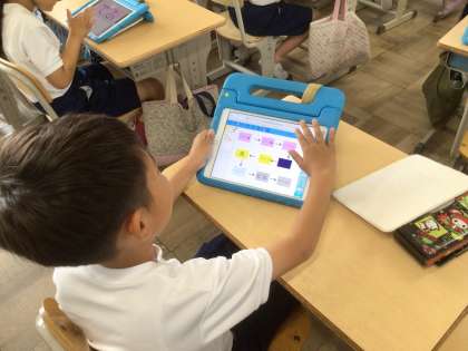 ICT支援員さんに、学習用タブレットの文字入力の仕方を学びました。しりとりをしながら、楽しく文字入力をすることができました。