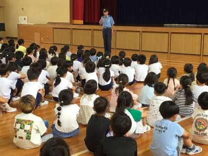 6月25日(火)に、不審者対応訓練を行いました。今回は、校舎内に不審者が侵入した想定で、危険回避行動をとる訓練でした。訓練の前に各クラスで、不審者から身を守るために『遠ざかるように逃げる・隠れる』『部屋に入らせない』『不審な声をキャッチする』などの対応について学びました。その後、不審者役の先生に校舎内を動いてもらい、子どもたちは教室の扉を机でふさぎ身を潜める避難行動の訓練をしました。訓練終了後には体育館に集まり、警察署の方のお話を聞き、自分の身を自分で守る行動について教えていただきました.