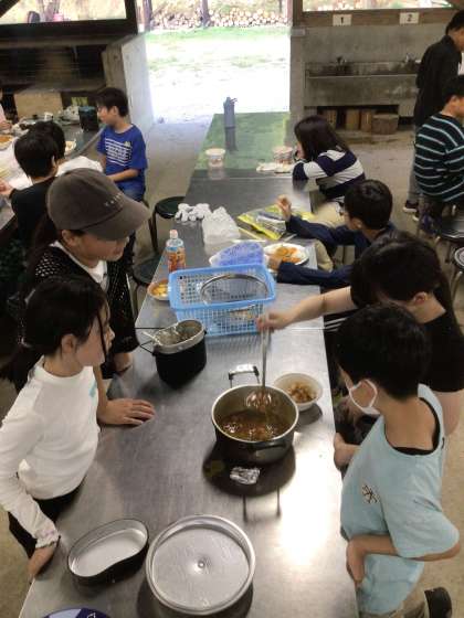 野外学習(その1) 公開日 2024/10/07 更新日 2024/10/07 各学年から 全員で協力し、充実した2日間を過ごすことができました。 オリエンテーリングでは、班で相談しながら目印の缶を探して山を散策しました。 カレー作りでは、火起こしに苦戦する班もありましたが、起こした火を絶やさないように協力してうちわであおいでいました。 キャンプファイヤーでは、1組「木とリス」、トーチワーク、2組「はいよろこんで」を行いました。大盛り上がりの1日目でした。