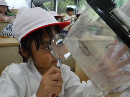次に、本館前の広場でバッタやコオロギなどの生き物を見つけ、どんな体のつくりをしているか、じっくり観察をしました。