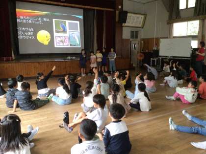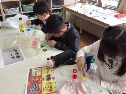追分小学校へ行き交流会を行いました。追分小学校では、ブローチ作りや追分小クイズ、自然観察会など追分小の子たちと一緒に楽しむ姿が見られました。