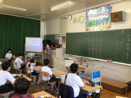 豊田市中央図書館出前講座の授業の様子です。調べ学習の要点を教えていただきました。くらしの中の和と洋新聞を作る準備として、比べる観点をもつこと、調べたことと自分の考えを分けて書くことの大切さを学びました。