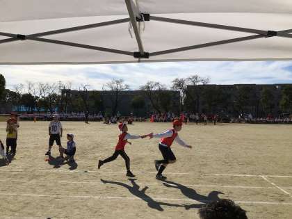 高学年のリレーは迫力あります。ダッシュ力、バトンパスの技術、どちらも流石のリレーでした。