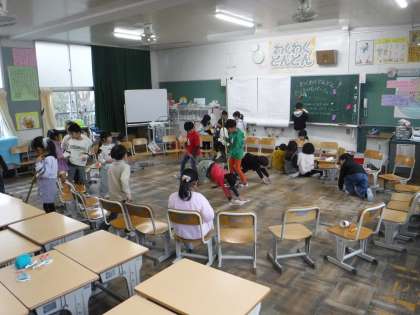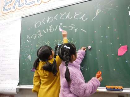 1年生「さつまいもパーティー」準備の様子 公開日 2024/11/20 更新日 2024/11/20 お知らせ 1年生が育てたさつまいもを食べる会「わくわくどんどんさつまいもパーティー」を行いました。 事前に子どもたちは、会の名前や、パーティーでやりたいことなどを話し合い、教室の飾りを作りました。 写真は準備をしている様子です。