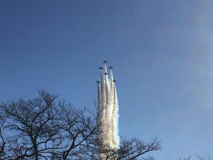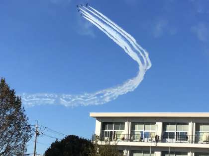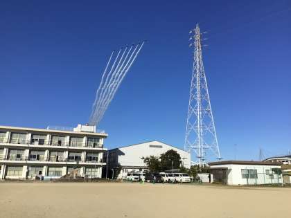 世界ラリー選手権のイベントの一つである「ブルーインパルス航空ショー」を学校の運動場で全校児童が観覧しました。
