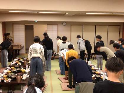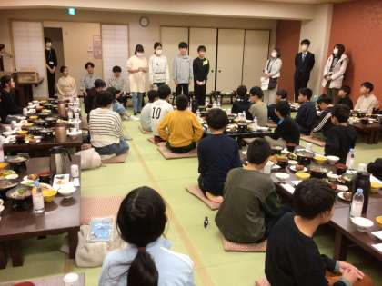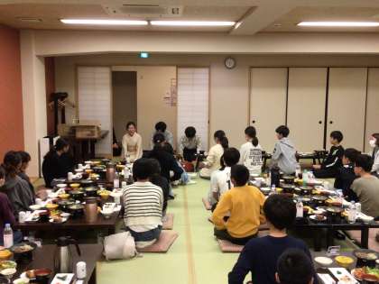 旅館に到着し、部屋に荷物を運んだ後、旅館到着式を行いました。旅館の女将からも挨拶をいただきました。この後すぐに夕食です。