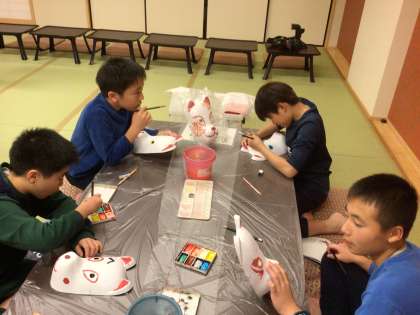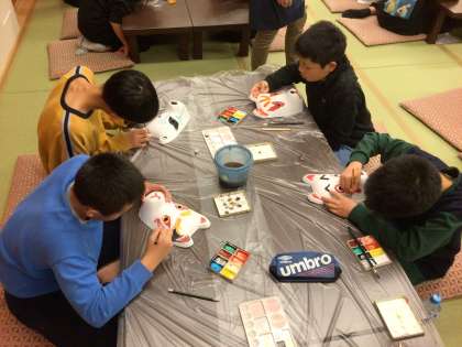 狐面づくりのグループです。白い面に色を塗り、オリジナルの狐面をつくります。実際に顔につけることもできる面です。