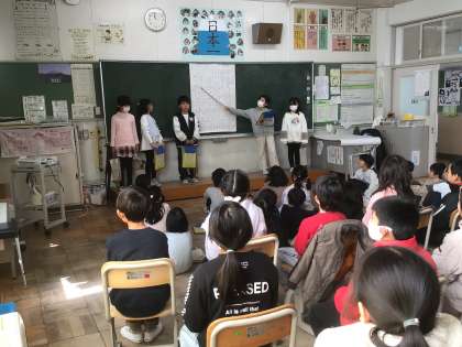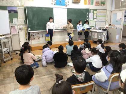 1年生と3年生を招待して、町探検新聞の発表会を開きました。元城の町にあるお店の紹介をして、1・3年生にいろいろなことを知ってもらうことが出来ました。明日の学習発表会へ向けて、一生懸命に頑張りました。