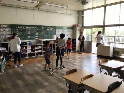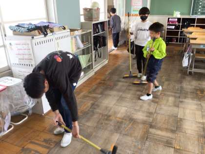 一番上級生のお兄さん、お姉さんとして、1年生の子と一緒に掃除をしています。「こう、するんだよ」や「こっちきて、見てて」と声をかけながら優しく教えている姿がとても輝かしいです。