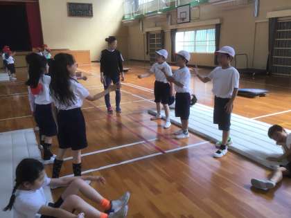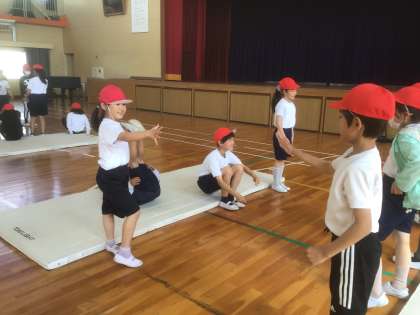マット運動です。じゃんけんで負けたらもう一回!盛り上がっています。