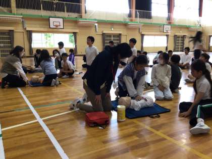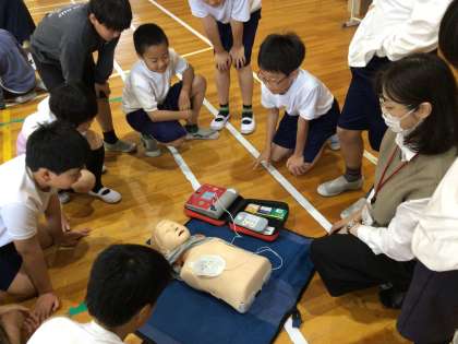 心停止をして倒れている人を見かけたときの、「胸骨圧迫(心臓マッサージ)」の仕方や、「AED」の使い方を学びました。