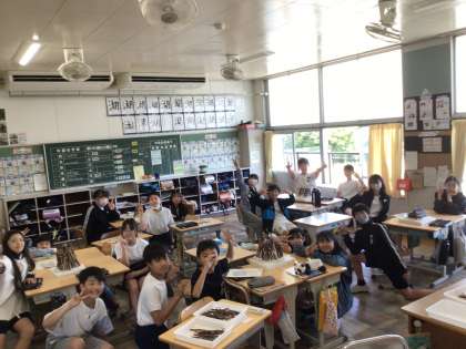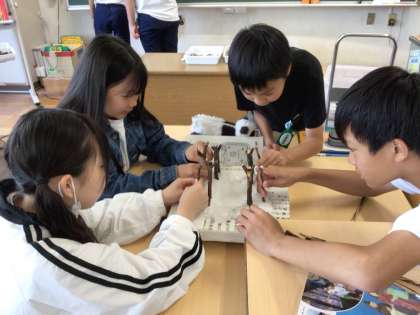 曽根遺跡見学を前に模型を使って、縄文時代の住居を建てる体験をしました。