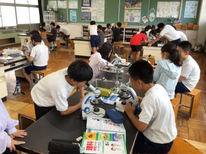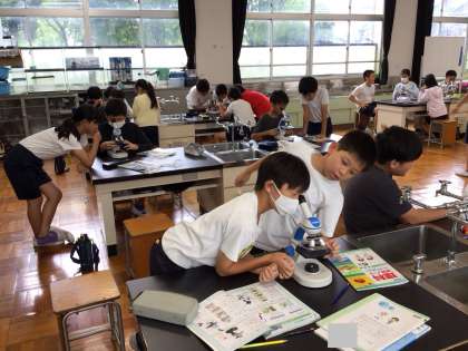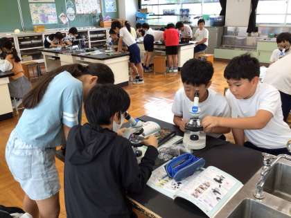 5年生理科「顕微鏡の使い方」 公開日 2025/09/06 更新日 2025/09/06 お知らせ 理科の実験道具、「顕微鏡」の使い方を練習しました。 準備の手順や、上手く見たいところにピントを合わせる方法など、基本をしっかり確かめ、「ハワイの砂」や「水中の微生物」など、いろいろなものを観察しました。
