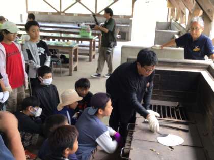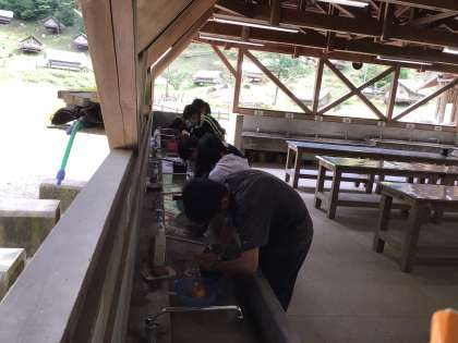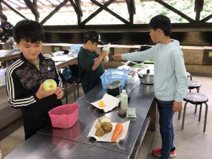野外炊事が始まりました。 食材やかまどの準備をしています。