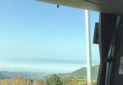 奈良盆地を上から見下ろすと、雲海?霧?が覆っていました。珍しい景色のようです。法隆寺に到着しました。