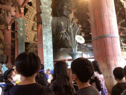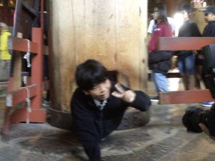 東大寺大仏殿に到着しました。写真ではここまでの迫力は感じられません。入口に立っている観光客のかたの大きさと比べると、大きさがさらに実感できます。柱に開けらえた穴は、大仏像の鼻のあなの大きさと同じくらいのようです。みんなが体験することができました。とてもテキパキと行動できたので、短い時間にみんなが体験できました。協力と思いやりパワーを発揮できた成果です。