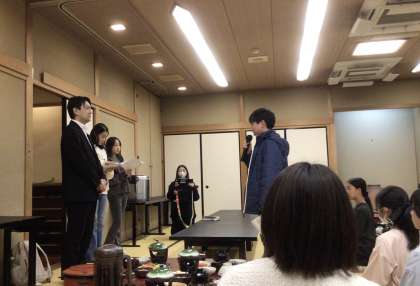 旅館に到着しました。加茂川館はにぎやかな通りに面しています。こじんまりとした宿の中でも、マナーを守って行動できるように、声を掛け合えています。大広間で到着式を行いました。リーダーからは、ここまでの日程で、みんなの協力で時間が生み出せて、結果として体験できることが増えたことなどが話されました。