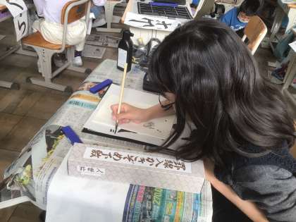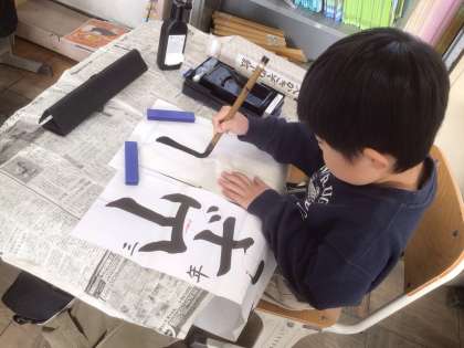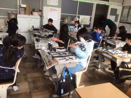 【3年生】書き初め練習 公開日 2025/12/05 更新日 2025/12/05 各学年から 3年生から毛筆の学習が始まりました。書き初めも毛筆に挑戦です。この日は、2クラスとも書き初め練習をしていました。手本をよく見て丁寧に書くことができました。