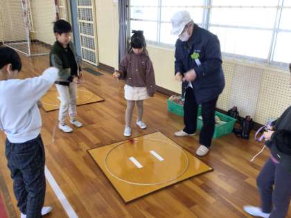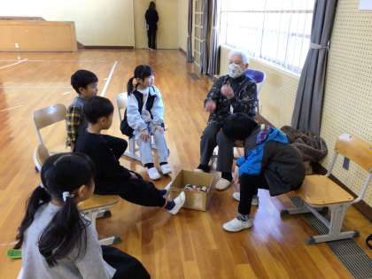 1年 むかし遊び会(その2) 公開日 2025/12/15 更新日 2025/12/15 特色ある学校づくり推進事業 昔から伝わる遊びを教わりながら、一緒に楽しむ1年生の子どもたちとお年寄り双方の笑顔が印象的でした。終わりの会では、お越しくださった桜寿会の皆さんへ、子どもたちが歌のプレゼントをしました。音楽の時間に習った『さんぽ』『ひのまる』『うみ』『校歌』を元気よく歌う子どもたち。一緒に口ずさんでくださる方もいらっしゃり、子どもたちも嬉しそうでした。楽しく、心温まる会になりました。
