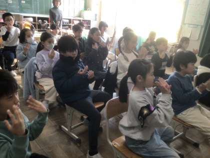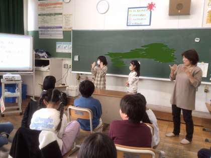 講師の先生をお招きし、手話体験をしました。前半は、耳が聞こえない生活についての話を手話通訳さんを通してうかがいました。後半は、講師の先生から直接話を聞き、身近な手話を学びました。「学校の名前は元城小学校です」や「好きな勉強はなんですか?」「好きな色はなんですか?」など、たくさんの手話を覚えて使ってみました。休み時間には、個別に講師の先生に自分の名前の手話を教えてもらい、多くの子が得意げに自分の名前を手話で表していました。