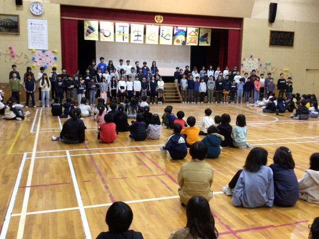 各学年全員と6年生選抜児童との対決で楽しく盛り上がった後、在校生が6年生に『ありがとうの花』を心を込めて歌いました。その後、6年生と5年生で『あと一つ』を合唱し、きれいなハーモニーが体育館に響き渡り素敵でした。最後に、6年生から5年生に校旗が引き継がれました。6年生のみなさんは、あと2週間余りで卒業の日を迎えます。今日の送る会も楽しい思い出の一つとなったことでしょう。