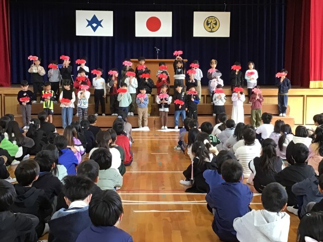 3月24日は、今年度のクラスの友達、担任の先生と過ごせる最後の日でした。修了式では、学年ごとに、校長先生から修了証を受け取りました。その後、1、3、5年生の発表がありました。1年生は、国語で学習した『スイミー』の文章を覚え、割り振られたセリフを全員がしっかり言うことができました。3年生は、総合の時間に覚えた手話をつけて、『ありがとうの花』を心を込めてきれいな声で歌うことができました。5年生は、代表児童2名が、それぞれ1年間を振り返り、努力したこと、学んだこと、来年度に向けての抱負などを立派に発表しました。最後に、校長先生のお話では、今年度頑張ってきた3つの『あ』(あいさつ、あんぜん、ありがとう)が、みんなしっかりできたことを褒めていただきました。