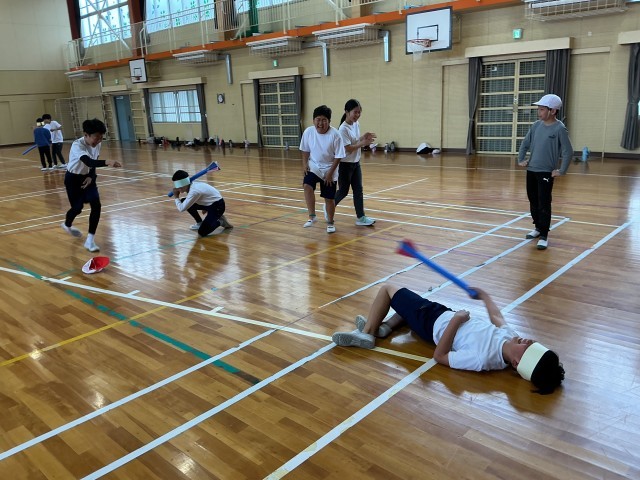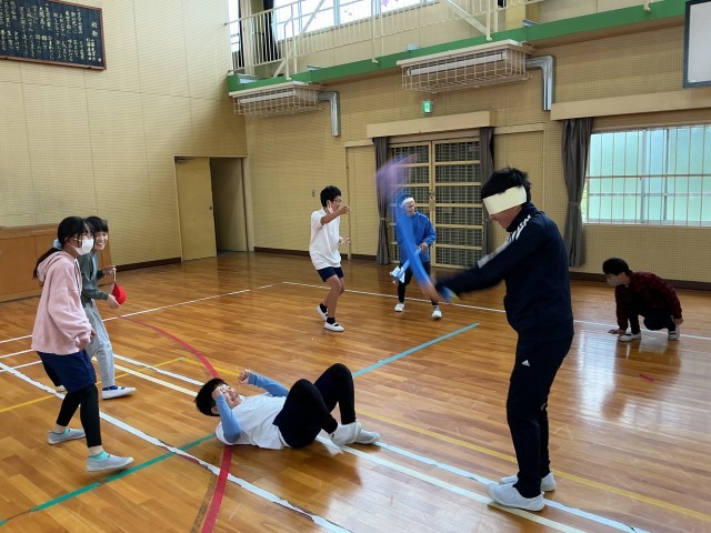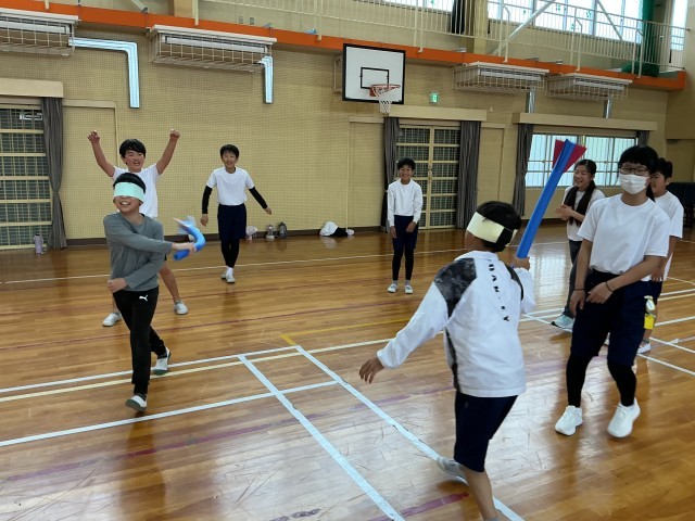 6年生 レクリエーション体育 公開日 2026/04/15 更新日 2026/04/15 お知らせ 体育で、遊びの要素を入れた運動に取り組みました。1対1でお互い目隠しをして柔らかい棒を持ち、仲間の声を聞いて相手を探し、先に相手を叩いた方が勝ちです。予想できない動きが展開され、大変盛り上がりました。 +1