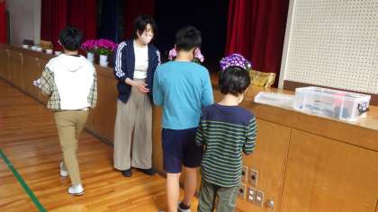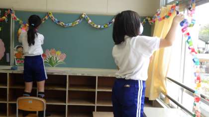 4月5日(月)、新5,6年生が登校して、明日の入学式の準備をしました。会場となる体育館に椅子や鉢植えを並べたり、教室を飾り付けたりしました。お客様のスリッパ、玄関の掃除等、職員も総出で準備です。