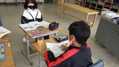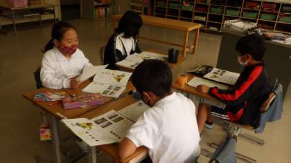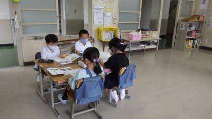 4年生社会科「愛知県の様子を調べよう」の授業です。愛知県について調べたいこと(地形、土地の利用の様子、農業、工業など)を学習課題とし、一人で資料を調べたあとに、グループで話し合っているところです。