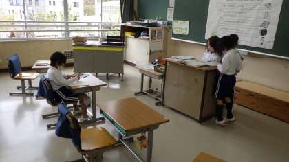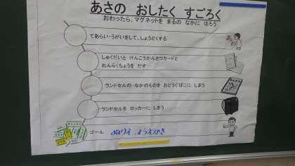 子どもたちは、学校に来てから朝の会までに、手洗いをしたり、健康カードを出したり、荷物を収めたりします。1年生の教室には、黒板に「おしたくすごろく」が貼られていました。子どもたちはこのすごろくに、自分の名前を貼って動かしながら、朝やることを確認しながら進めています。読めない字があっても、イラストが描いてあるので分かります。朝の会の始まる前には、全員、やるべきことを終え、時間までに席につくことができていました。素晴らしいですね。
