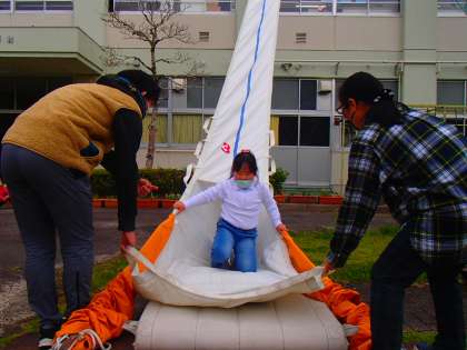 その後は、3階にある避難救助袋から降りる練習です。1年生は初めての体験です。怖がったり嫌がったりする子もなく、スムーズに避難ができました。