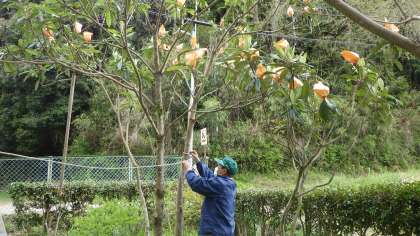 学校の木の手入れをしてくださる地域ボランティアの方が来校し、ビワの摘果と袋かけをしてくださいました。ビワの実は、たくさん付いたままにしておくと、小さい実になってしまったり、日が当たらずに傷むところが出てきたりするのだそうです。実を減らし、鳥に食べられないように袋をかけてくださいました。全てに袋をかけるのではなく、子どもたちの観察用&鳥さんにおすそ分け用として、袋をかけないところも作ってくださいました。