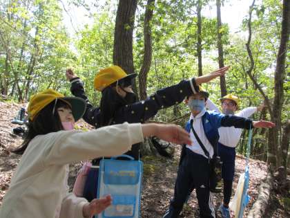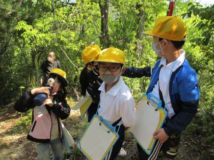 頂上にたどり着くと、子どもたちは「景色がいい。」「学校が見える」と喜んでいました。付近を散策し、継続観察をするための自分の木を決めて撮影をしました。今日の活動を元に、今後の活動の計画を決めていきます。