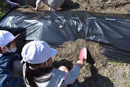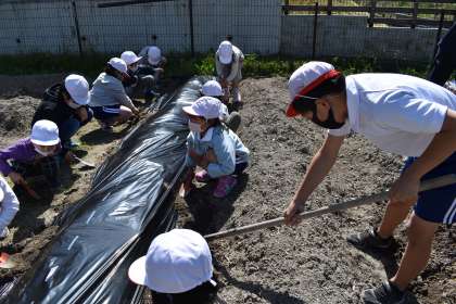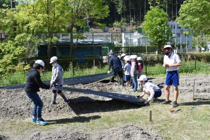 マルチ張り 公開日 2021/04/26 更新日 2021/04/26 お知らせ 5,6年生の代表委員と美化・栽培委員と、1,2年生が、畑のマルチ張りを行いました。5,6年生がマルチを広げ、1,2年生が周りに土をかけました。1,2年生だけだと大変な作業ですが、5,6年生が手伝ってくれたので上手にできました。 1年 2年 委員会