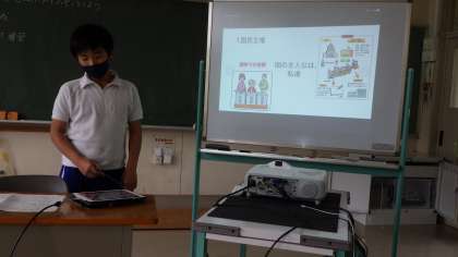 プレゼン 6年生 公開日 2021/05/11 更新日 2021/05/11 お知らせ 6年生が社会科で「日本国憲法」について学習しました。自分たちでプレゼンの資料を作り、発表をしあっていました。 個々にタブレットを操作し、教科書の写真や自作の絵に字を入れこんで作った資料をプロジェクターで映し、自分で操作しながら話をしました。内容を検討したり、互いに意見や感想を言ったりする時間は次回となりますが、タブレットを操作して説明ができるようになってきたことがすばらしいと思いました。 6年