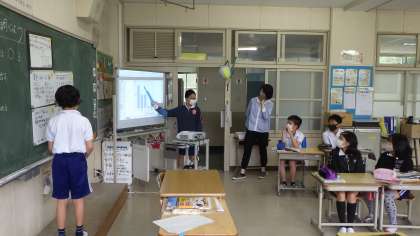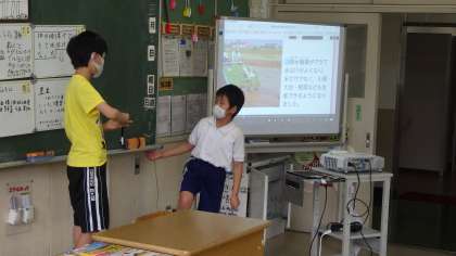 5年生が「低い土地のくらし」の学習で、輪中に住む人々の農業について、調べていました。資料集や教科書の資料から見つけたことをホワイトボードにまとめ、ペアで発表活動をしました。根拠となる資料をプロジェクターで映し、それを示しながら説明をします。土地の特色を生かした農業をしていることが分かりました。
