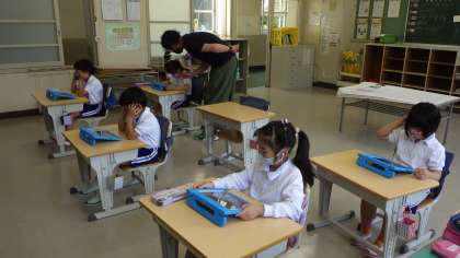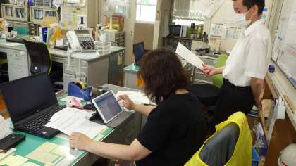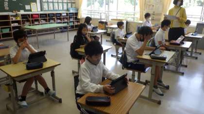 タブレットを使って全校で「オンライン朝の会」を行いました。教頭と教務主任が職員室からタブレット操作を行い、子どもたちは教室で自分のタブレットを見ながら、健康観察を書き込みました。今日は2回目だったので、昨日よりもスムーズにできました。